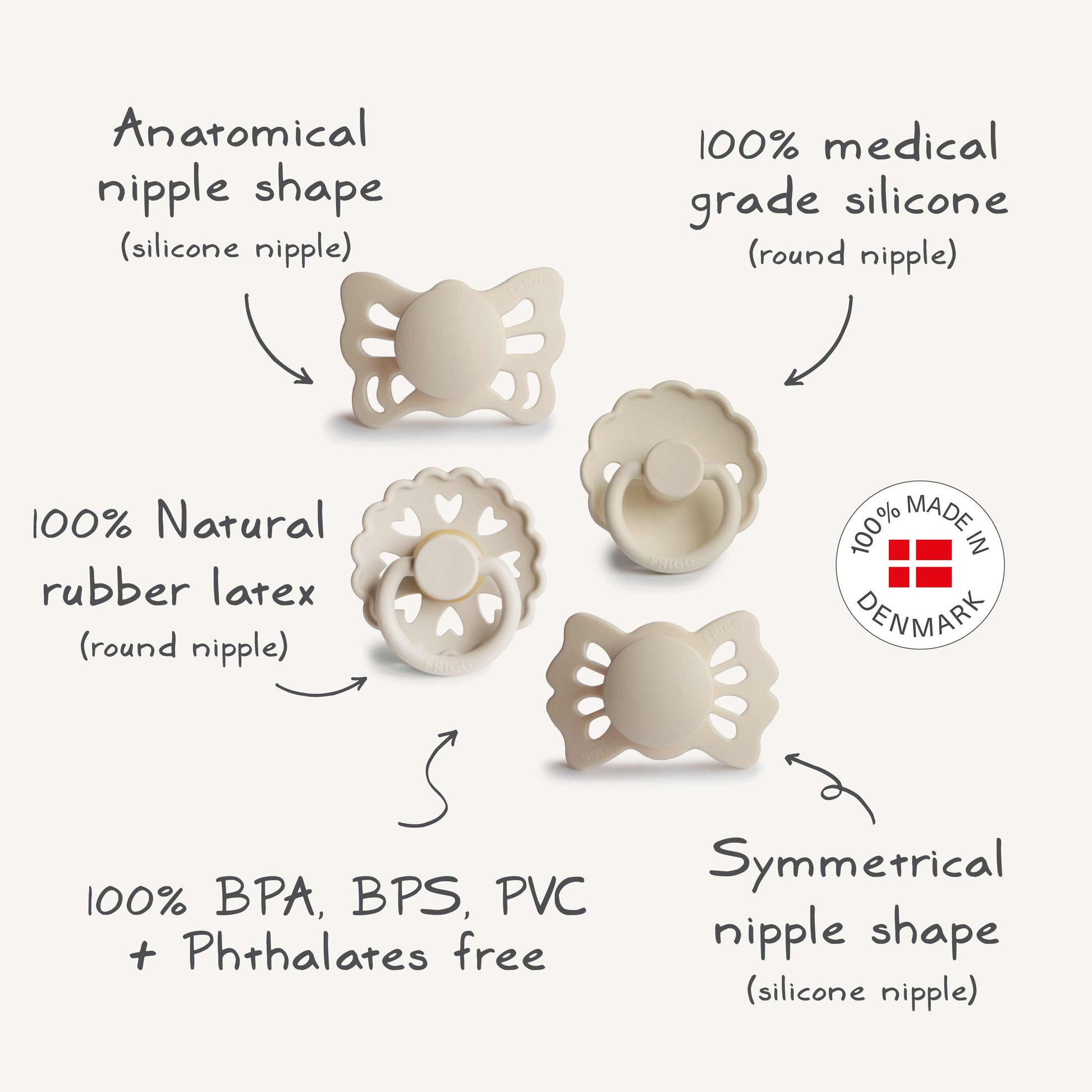 The FRIGG Baby’s First Pacifier set features 4 popular FRIGG styles with different nipple materials and shapes, so parents can easily try out various options to find out which works best for their baby's unique needs. With a variety all in one convenient set, parents can confidently discover their little one’s favorite, making those first soothing moments a little easier. Each pacifier is thoughtfully designed and made in Denmark with comfort and safety in mind.