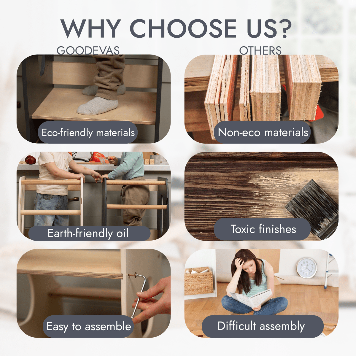 Eco-Friendly Materials: Made from natural wood and finished with non-toxic paints, this toddler tower is completely safe for your child and an environmentally responsible choice.