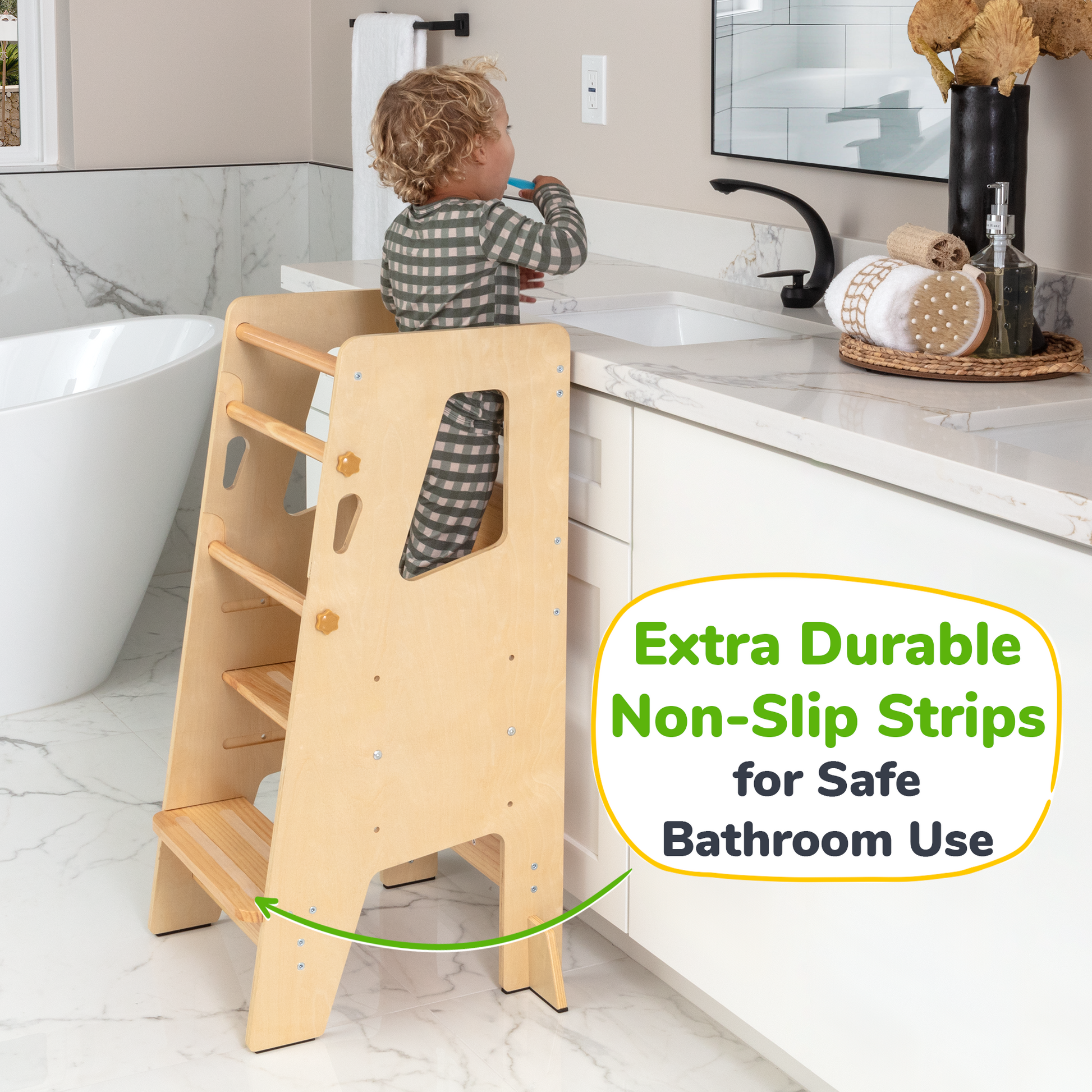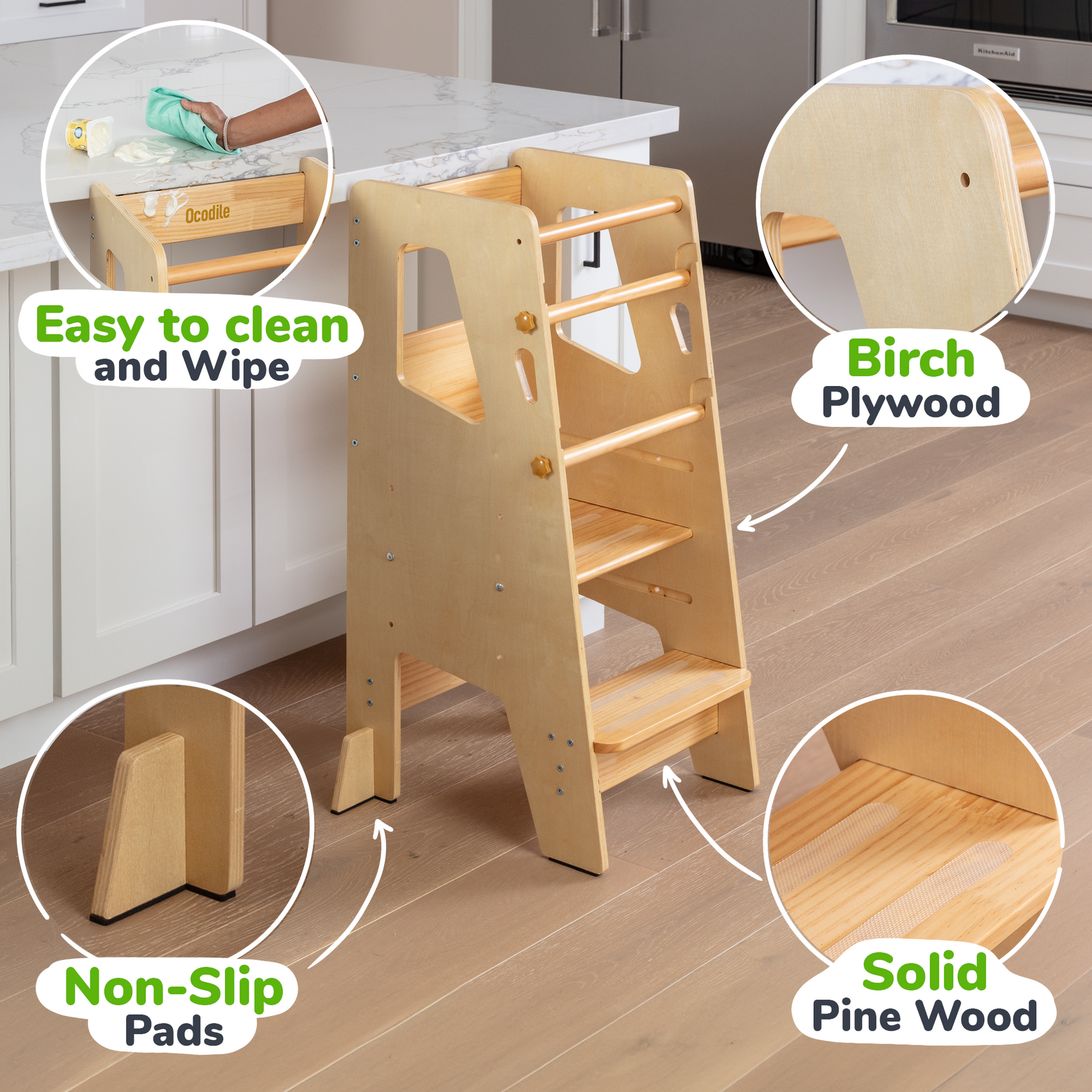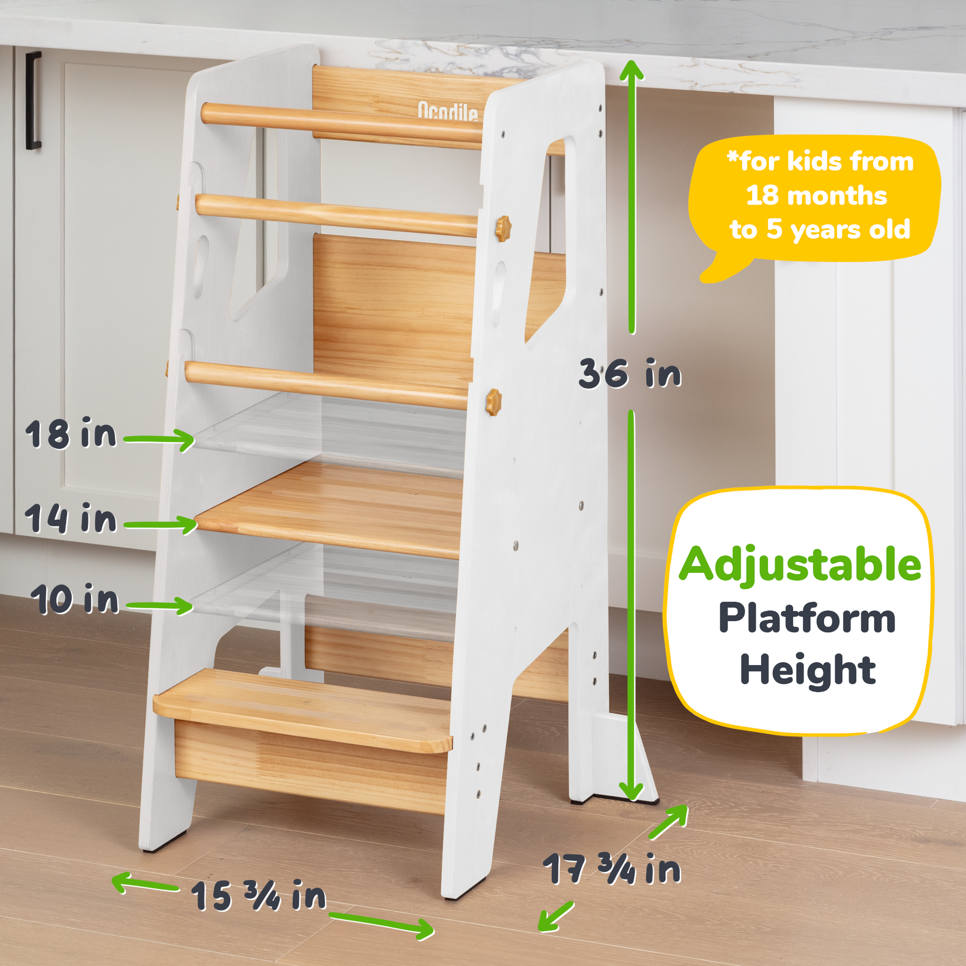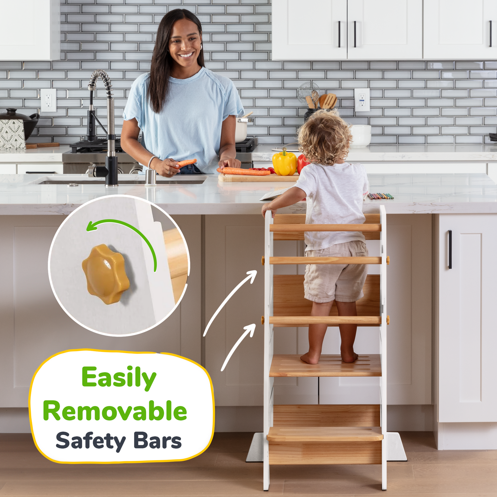This toddler tower is designed to empower children with independence, allowing them to climb up on their own and join in on kitchen and household activities. Its thoughtful design makes it easy and safe for little ones to engage, explore, and learn right alongside you.