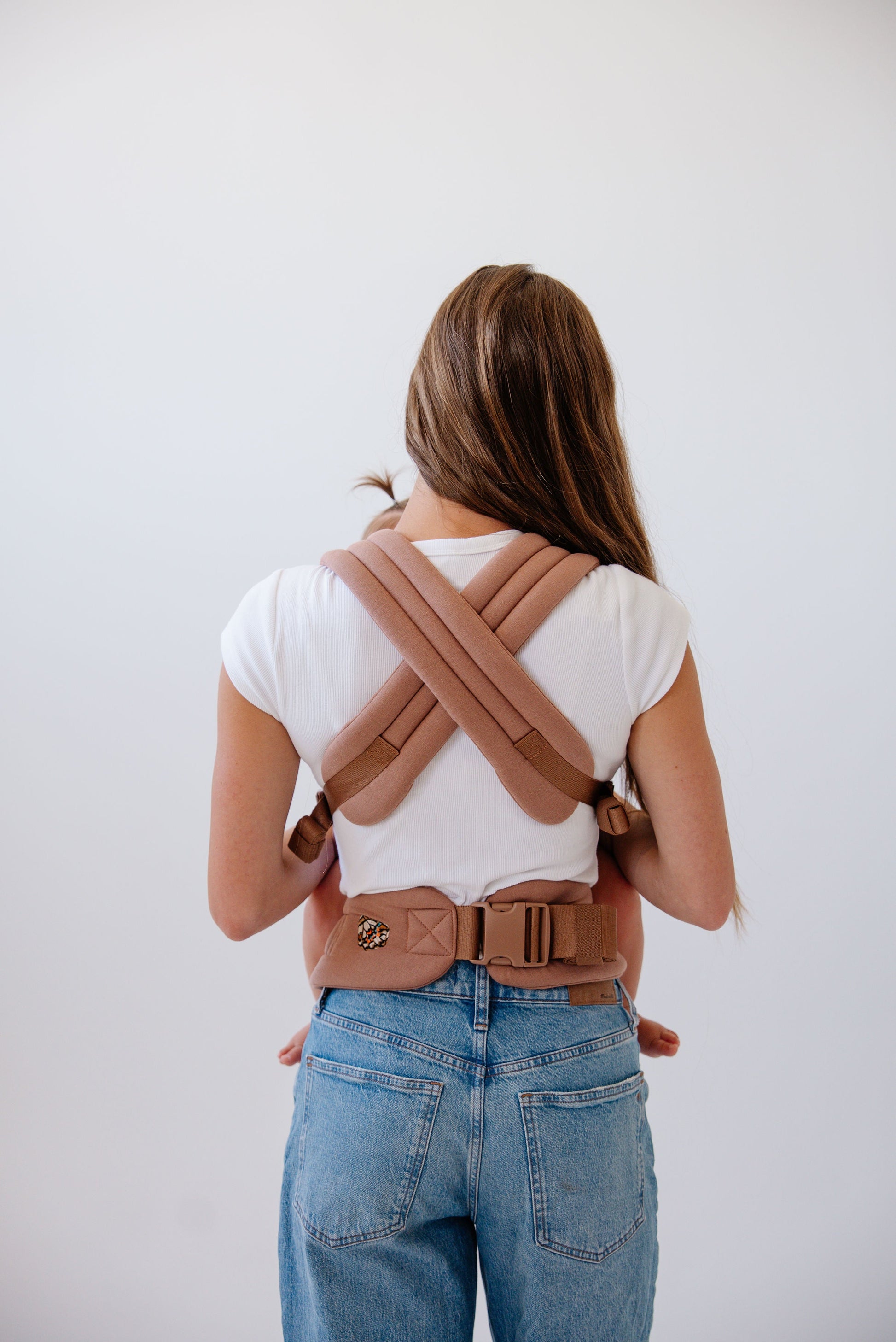 Our best selling carrier now available in a warm, medium brown. The fabric is a solid, jacquard cotton/linen.